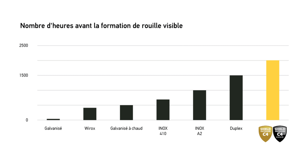 Dans le cadre de cette méthode de test la plus couramment utilisée, la résistance à la corrosion des vis est vérifiée par pulvérisation constante d’une solution saline. L’aperçu ci-dessous compare les performances du revêtement anticorrosion des vis Woodies® Ultimate Shield Outdoor à la résistance à la corrosion de diverses vis revêtues et en acier inoxydable. Le résultat : les vis Shield Outdoor (Blackline) résistent à ce test au brouillard salin pendant 2000 heures.